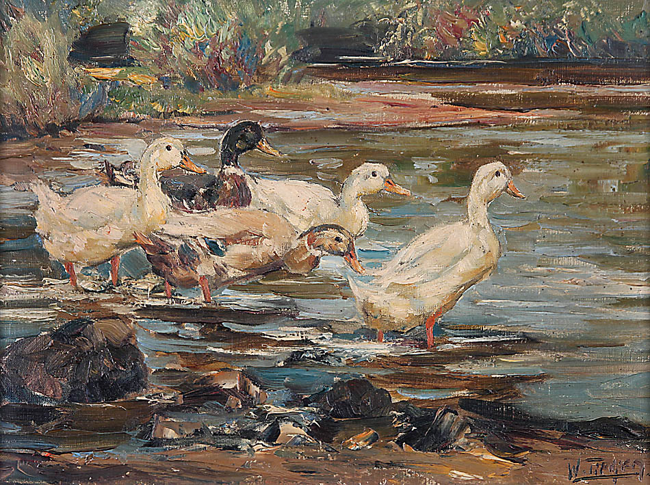 1881 Hamburg – 1950 München; deut. Maler und Zeichner. Studium an der Münchner Akad. bei Heinrich von Zügel. „Enten in Ufernähe“. Re. u. sign. W. Tiedjen. Öl/Lwd., 34,5 x 46,5 cm. R. (besch.).
