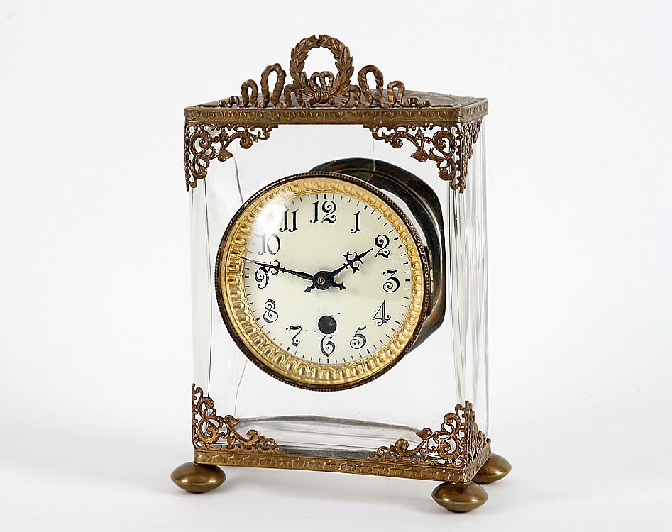 Um 1900. Glasgehäuse (auf der Rückseite oben kleinerer Sprung). Filigrane Messingmontierungen. Emailzifferblatt mit arab. Jugendstilziffern, schwarze Metallzeiger. Uhrwerk Messing mit Federaufzug, gangbar. Schlüssel vorhanden. Gebrauchsspuren. H 24,3 cm.
