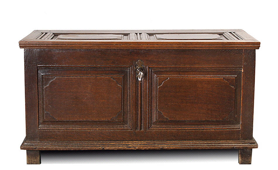 Wohl deutsch, 18. Jh.. Eiche, braun gebeizt, Alterspatina. Front und Seiten mit Profilschnitzereien. Deckel mit zwei profiliert geschnitzten Rahmenfüllungen. Eisenbeschläge, Eisenschloss mit Schlüssel, Schlüsselschild Messing. H 65 cm, L 120,5 cm, B 61 cm. Zustand C (Alters- und Gebrauchsspuren, Deckelrand mit alten Ergänzungen).