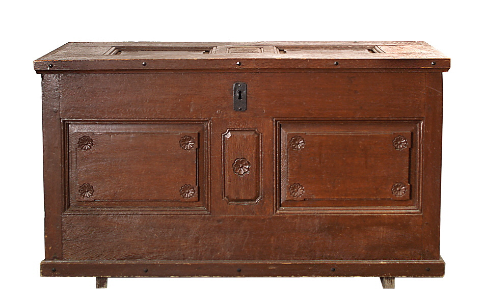 Mosel(?), Ende 18. Jh.. Eiche, braun gebeizt. Front und Seiten mit Profilschnitzereien und kleinen Rosetten. Deckel mit zwei geschnitzten Profilfüllungen, dazwischen Reliefschnitzerei mit Monogramm A.M.L., dat. 1790. Eisenbeschläge, Eisenschloss, der Schlüssel fehlt. H 69,3 cm, L 120,5 cm, B 61,5 cm. Zustand C (Alters- und Gebrauchsspuren).