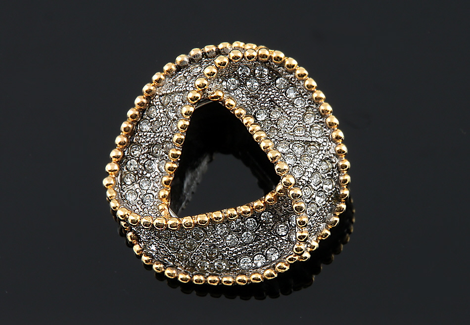 Form eines verschlungenen Bandes. Silberfarbenes Metall, teilvergoldet, Similesteine. L ca. 4 cm.