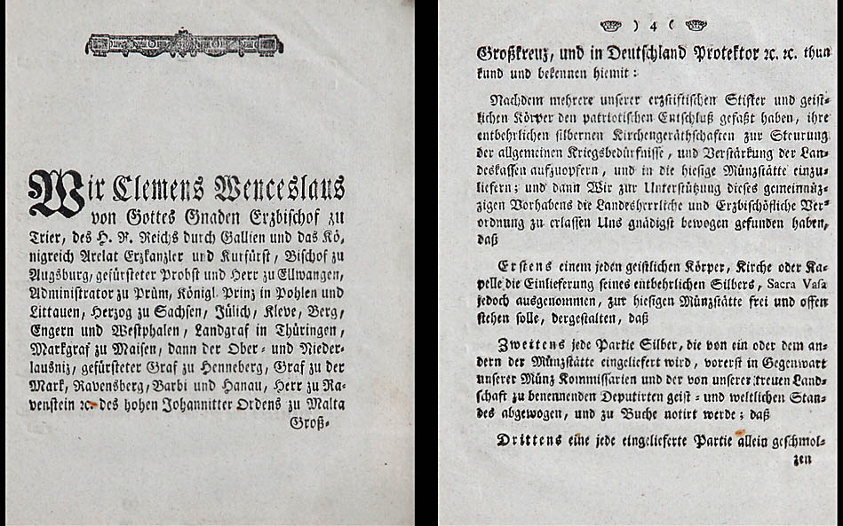„Wir Clemens Wenceslaus von Gottes Gnaden Erzbischof zu Trier, des H. R. Reichs durch Gallien und das Koenigreich Arelat Erzkanzler und Kurfuerst, Bischof zu Augsburg…“. Beidseitig betextes Blatt. Im verglasten Stuckrahmen.