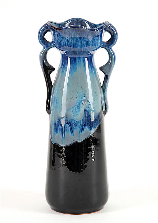 Konischer Gefäßkörper, oben bauchig weitend mit geschwungener Lippe. Zwei offene, doppelt geschwungene Handhaben. Schwarz-blau glasierte Keramik. H 31,5 cm.