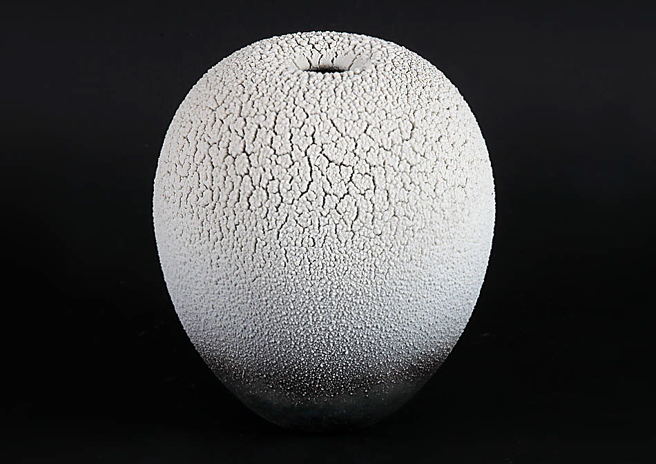 Ausführung: Mieke Groot(?). Am Boden ligierte Ritzsign.: MG.(?), dat.(?) 95. Bauchiger Gefäßkörper mit kleiner Öffnung. Dunkelgrau, speckig glänzend glasierte Keramik, hellgrauer, sandartiger Überzug mit Craquelé. H 18,7 cm.