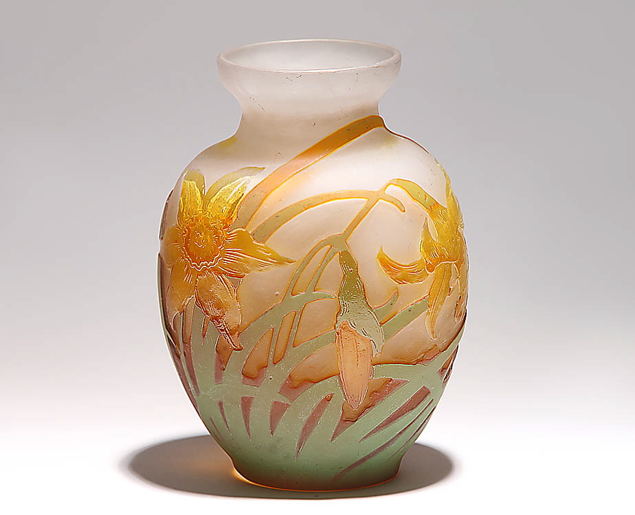 Stil Gallé. Balusterförmiger Gefäßkörper. Farbl., mattiertes Glas, herausgeätzter Blumen- und Gräserdekor in Gelb, Braun und Grün. Unten auf der Wandung in geätzter Reliefschrift bez.: Gallé. H 17,8 cm.