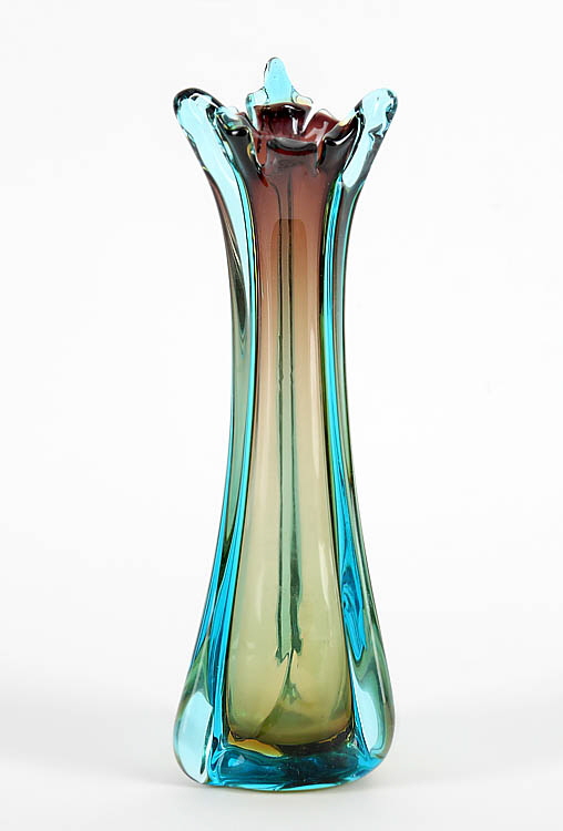Italien, Murano. Konischer, unten und oben weitender Gefäßkörper, mehrfach eingekerbte Lippe. Hellblaues und lila Überfangglas. H 32,3 cm.