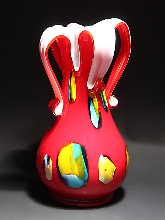 Holland, Simais-Glas. Bauchiger Gefäßkörper in konischen Hals übergehend, oben vierfach nach außen gelappt, konische Standfläche mit Abriss. Überfangglas farbl., rot und weiß, Einschmelzungen in Gelb, Türkis, Blau und Schwarz. H 33,5 cm.