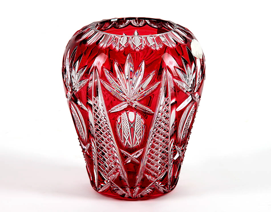 Süddeutsch. Konischer Gefäßkörper mit runder Schulter. Rot überfangenes Bleikristall, mundgeblasen, handgeschliffen. H 12,9 cm.