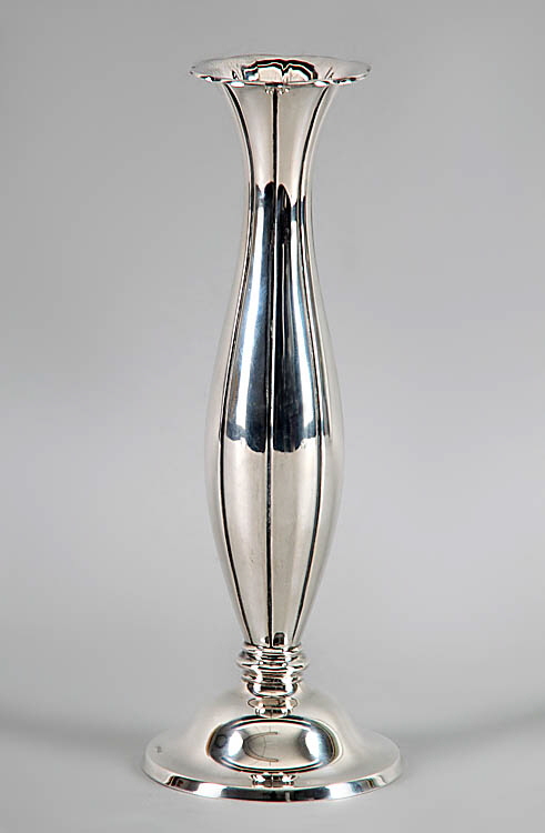 835er Silber. Herstellermarke: Gottlieb Kurz, Schwäbisch Gmünd. Schlanke, bauchige Form, runder, gewölbter Fuß (gefüllt). Rillendekor. H 22 cm.