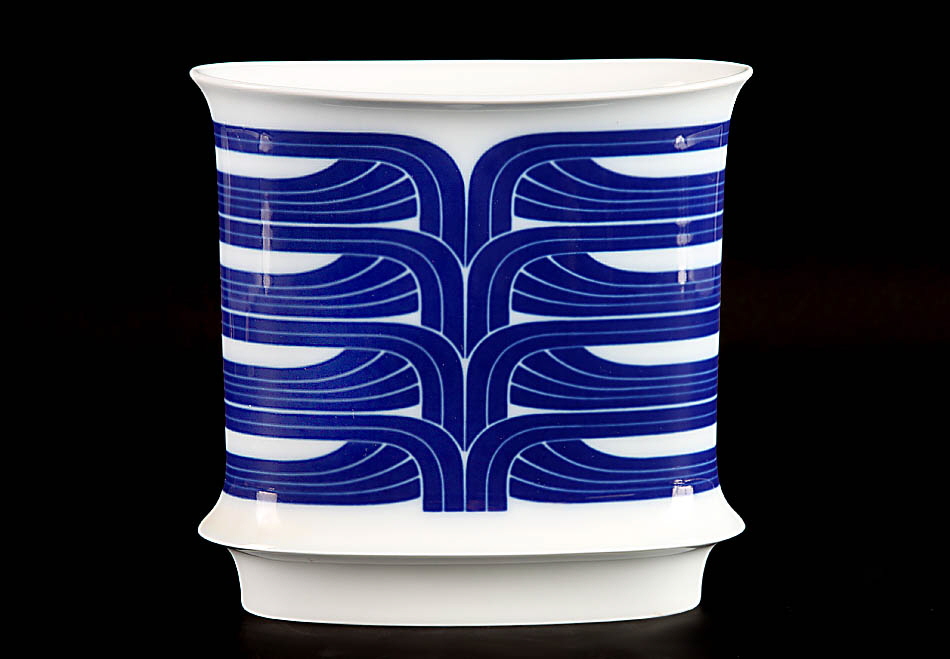 Rosenthal, studio-linie, Manufakturstempel. Ovaler Gefäßkörper. Weiße, glänzende Glasur, ugl. abstrakter Blaudekor. H 22,6 cm.