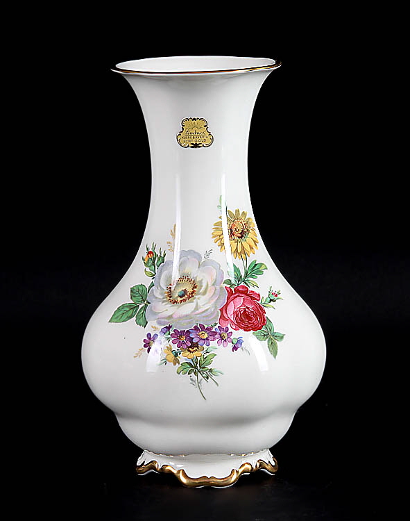 Küps, Lindner Porzellanfabrik, Manufakturstempel, vor 1982. Bauchiger Gefäßkörper in schlanken Hals mit ausschwingender Lippe übergehend, konischer, geschwungener Standring. Bunter Blumendruck, Golddekor. H 27 cm.