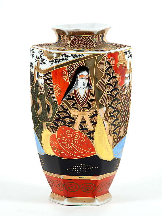 Japan, ca. 1. Hälfte 20. Jh.. Porzellan. Konisches, sechskantiges Schultergefäß mit kurzem Hals und sechskantiger Lippe, konischer Fuß. Weiße Glasur, bunte Emailbemalung und Goldemail. Auf der Wandung umlaufend verschiedene Figurendarstellungen, oben und unten veschiedene Ornamente. H 25 cm.