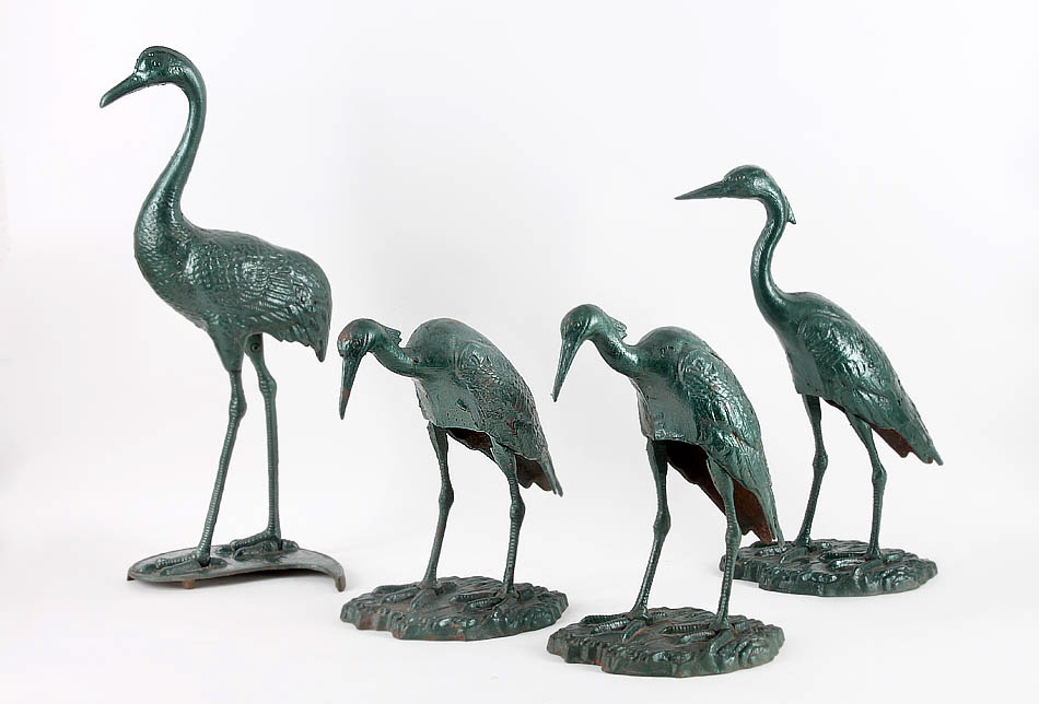 Verschiedene Vögel. Eisenguss, grün patiniert. H 63 cm, 50,5 cm, 38 cm, 35,5 cm. Gebrauchsspuren.