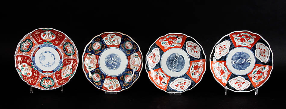 China/Japan. Zwei Teller am Boden mit ugl. vier blauen Schriftzeichen. Weiß glasiertes Porzellan, Bemalung in den typischen Imarifarben. Ein Rand mit Bestoßung. D 21,9 cm.