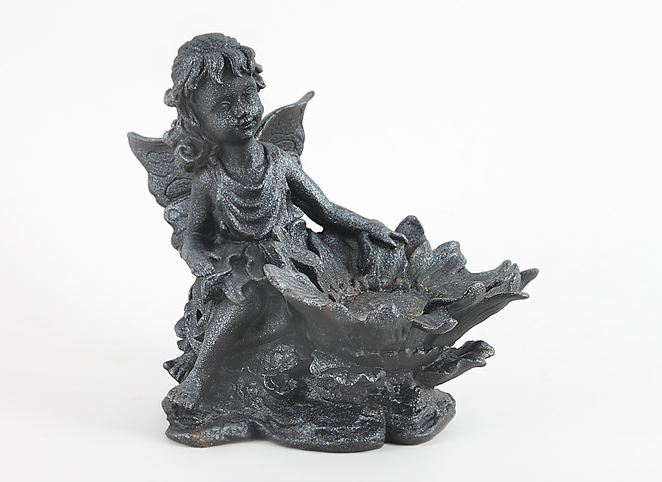 Form einer Elfe mit Blumenschale. Eisenguss, graue Patina mit etwas Goldflimmer. H 24,5 cm.