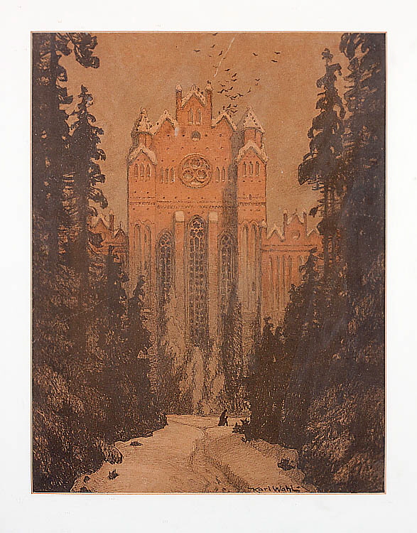 Deut. Maler und Grafiker, um 1900 ansässig in Eberswalde. „Kloster Chorin in Brandenburg“. Farblithografie/braunem Papier, re. u. im Stein sign. Karl Wahl. Ca. 45,5 x 34,5 cm (Bildausschnitt). Passepartout, vergl. R..