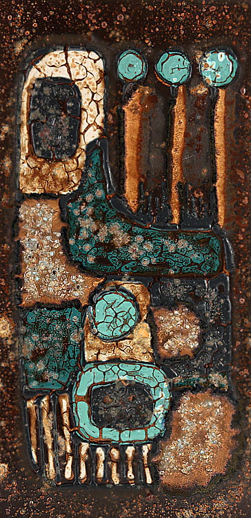 Abstrakte Darstellung. Bunt glasierte Keramik. 59,8 x 30 cm.