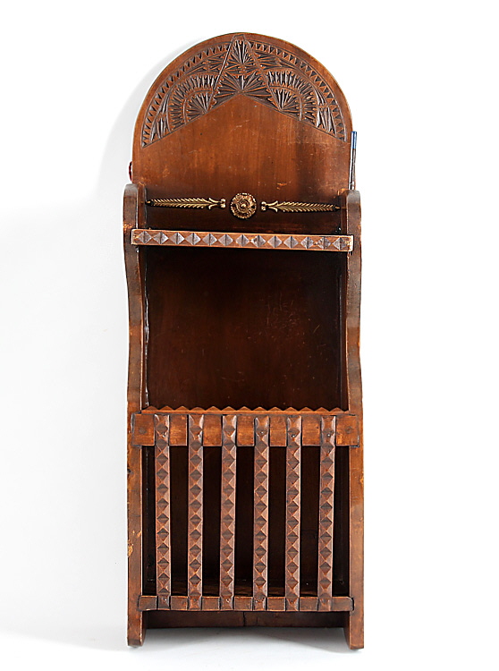 Buche, braun gebeizt, schöne Kerbschnitzereien, Messingapplik. Offenes Gefach, darüber eine Ablage. H 73 cm, B 27,4 cm, T 26,3 cm. Zustand B.