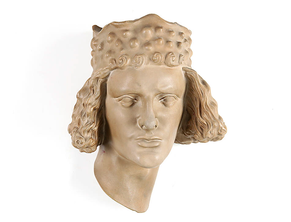 Kopf Kaiser Konrads III. Gips, graubraun patiniert. Oben bez.: „Kaiser Konrad III Bamberg Dom Gebrüder Micheli Berlin“. Die Gebrüder Micheli waren eine 1824 gegründete Gipsgießerei in Berlin. Oben eine größere Bestoßung. H 36,5 cm.