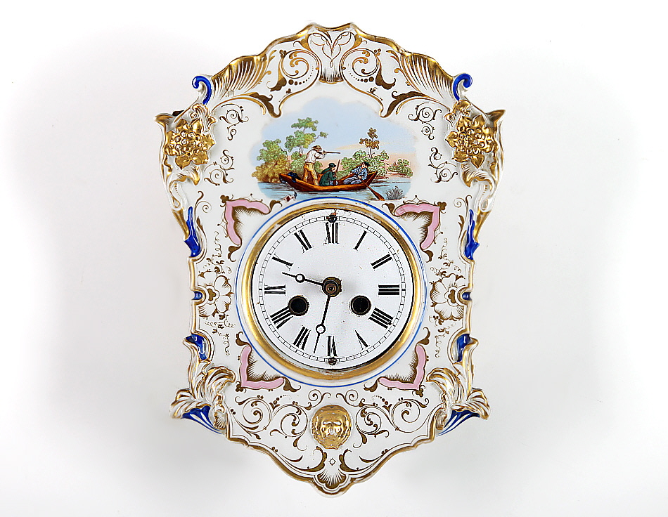 Ca. Ende 19. Jh.. Kasten aus Kirsch- und Nadelholz. Weiß glasiertes Porzellanschild mit Relief- und Golddekor, bunt bemalt und bedruckt, oben Szene einer Entenjagd. Emailzifferblatt mit röm. Ziffern, oben kleinere Absplitterungen, schwarze Metallzeiger. Das orig. Uhrwerk wurde durch ein neuzeitliches Quartzwerk ersetzt. Funktion nicht geprüft. H 32 cm.