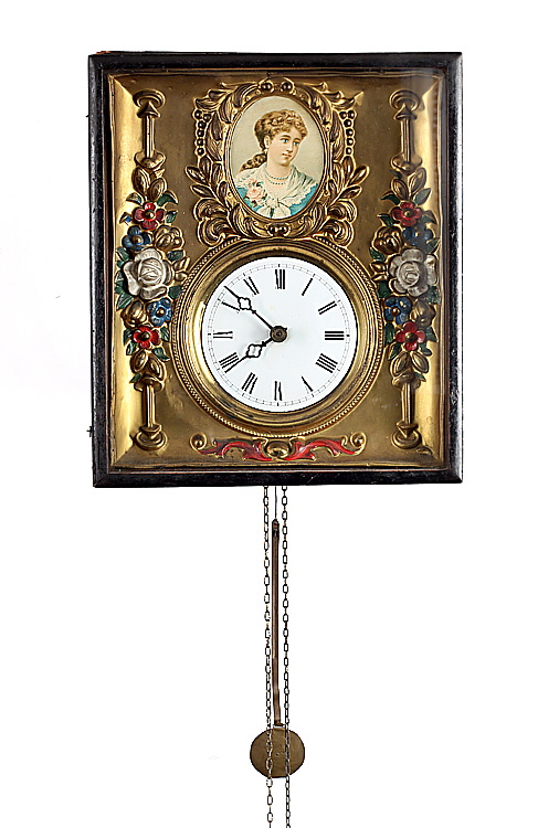 Schwarzwald, 19. Jh.. Holzkasten, geprägtes, vergoldetes Messingschild mit bemalten Blumen, oben in ovaler Kartusche bunte Papierlithografie mit Frauenbildnis. Emailzifferblatt mit röm. Ziffern, schwarze Metallzeiger. Messingräderwerk mit Holzplatinen, Aufzug mit zwei Gewichten (fehlen), Messingpendel. Schlagwerk für volle und halbe Stunden auf Tonspirale. Funktion nicht geprüft. H 33,3 cm.