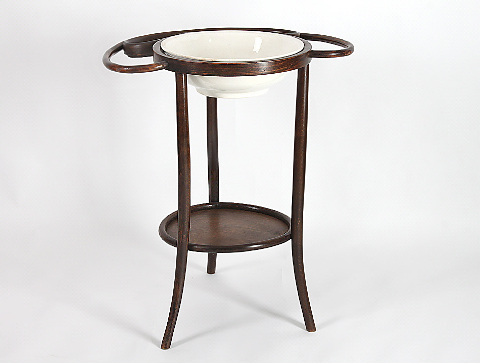 Bugholz. Buche und Sperrholz, dunkelbraun gebeizt. Oben zwei Halter für Handtücher, mittig runde Aussparung für eine Waschschüssel, daneben und unten eine Ablage. Dazu eine Waschschüssel aus weiß glasiertem Feinsteingut. H 78 cm, D oben 68,5 cm. Zustand B/C.