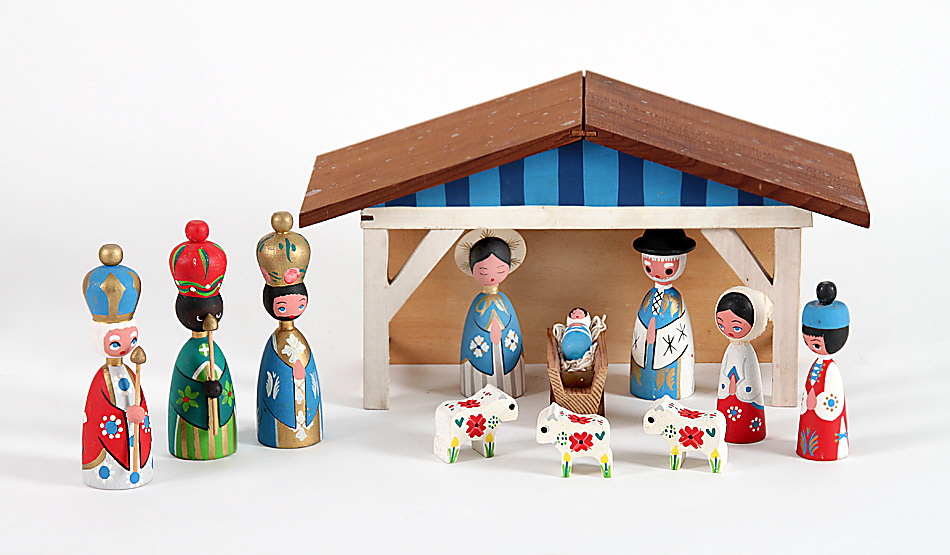 Krippenstall, 11 bemalte Holzfiguren. Dänemark, Bogense, Mogens Eigenbrod.