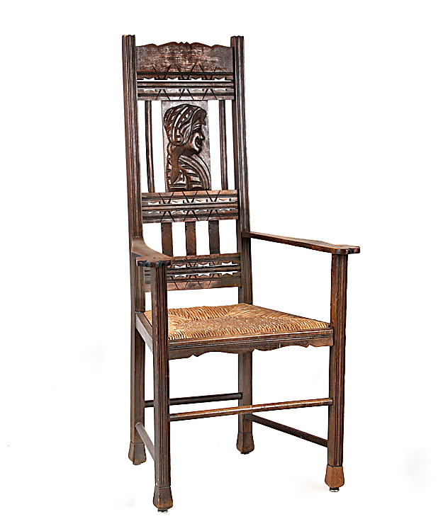 Um 1910. Buche, geschnitzt, braun gebeizt, Sitz mit Binsengeflecht. Rückenlehne mit Zierdurchbrüchen, mittig Brettchen mit Relief eines Kopfes im Profil. H 129,5 cm, B 67 cm, T Sitz 45 cm. Zustand B/C.