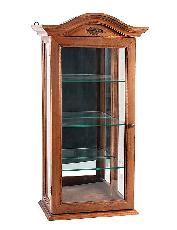 Im Stil des 19. Jhs.. Dreiseitg verglaster Kasten Nussbaum. Geschwungenes Profilgesims. Innen drei Glasböden und vespiegelte Rückwand. H 69,3 cm, B 36 cm, T 26,8 cm. Zustand B/C.