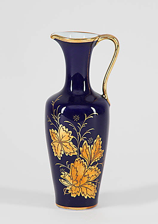 Waldenburg, Krister Porzellan Manufaktur, Manufakturstempel. Weiße und kobaltblaue Glasur, floraler und Streifendekor in Gold. H 16,9 cm.