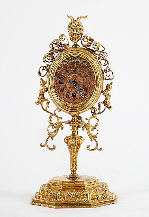 Ca. 2. Hälfte 19. Jh.. Form einer Monstranz. Bronze vergoldet. Um das ovale Uhrwerkgehäuse ranken sich feine arabeske Appliken, bekrönt von einem gehörnten Maskaron. Achteckiger Fuß mit Reliefverzierungen. Kupferfarbenes Zifferblatt mit röm. Ziffern und arab. 5-Minutenangabe. Werk mit Messingpendel, Schlüsselaufzug, gangbar, Schlüssel fehlt. H 18 cm.