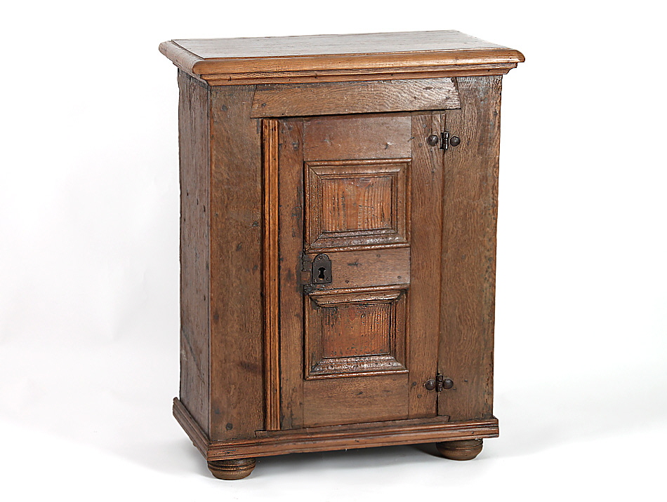 Eiche, geschnitzt. Eintürig mit zwei Rahmenfüllungen, Eisenbeschläge. Schlüssel fehlt. Deckplatte, Sockelleiste und Teil der Rückwand erneuert. H 82,5 cm, B 64,3 cm, T 34,5 cm. Zustand B/C.