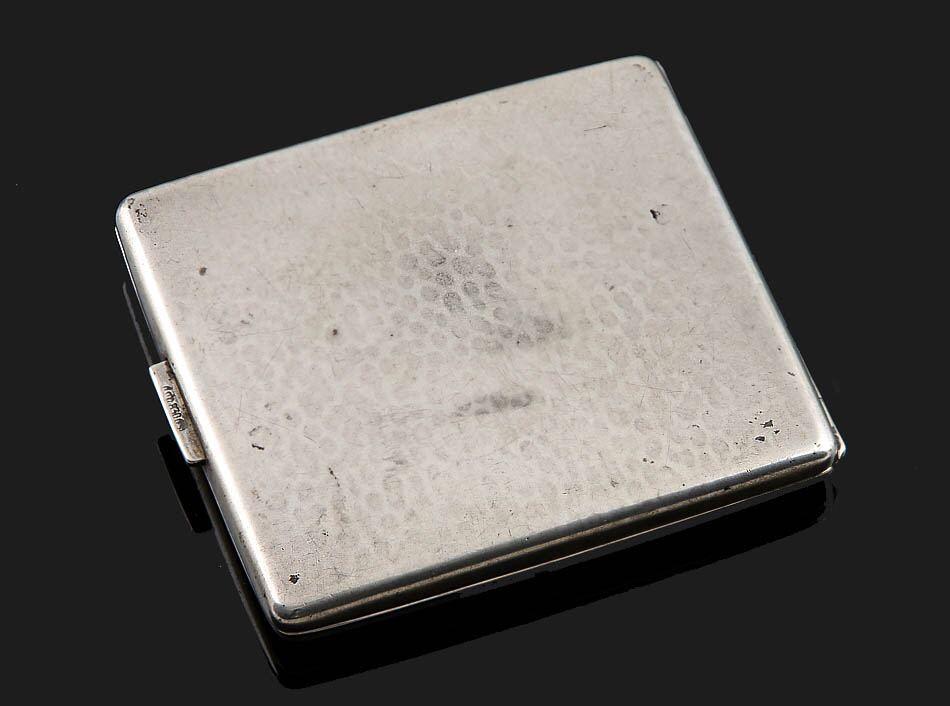 835er Silber, martelliert. Herstellermarke: Franz Scheurle, Schwäbisch Gmünd. Innen Widmungsgravur, dat. Herbst 1938. 8,7 x 7,5 cm. Gebrauchsspuren. 84,9 g.
