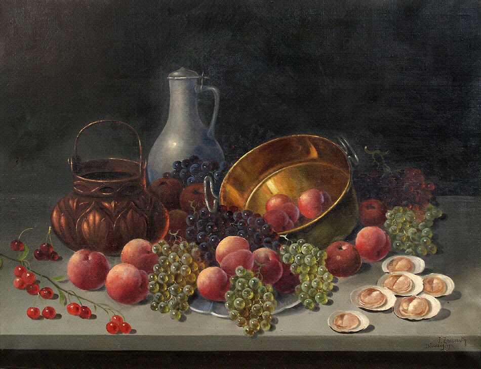 „Früchtestillleben“. Re. u. sign. J. Zimmerath, dat. Düsseldorf 1915. Öl/Lwd., 68,5 x 88 cm. Auf Keilr..