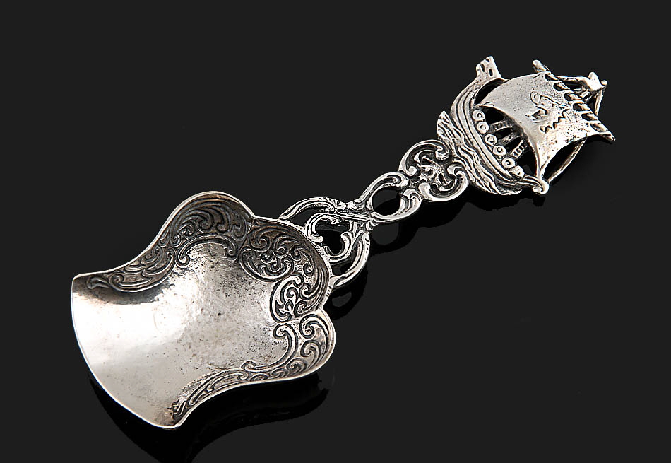 800er Silber, Herstellermarke: Christoph Widmann, Pforzheim. Durchbrochener Reliefstiel oben mit Segelschiff. L 11,2 cm. 27 g.