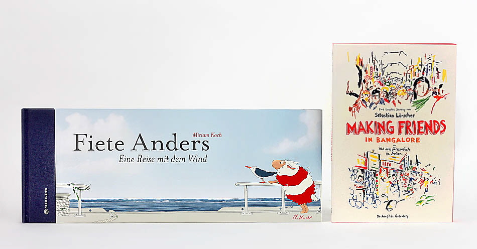1) Miriam Koch, „Fiete Anders, eine Reise mit dem Wind“. Titelseite von Miriam Koch sign., dat. 2014. Erstausgabe. Gerstenberg Verlag, Hildesheim 2012. 2) Sebastian Lörscher, „Making Friends in Bangalore“. Titelbl. vom Verfasser sign., dat. Frankfurt, 12.10.’14. Erstausgabe. Büchergilde Gutenberg, Frankfurt a. M. 2014.