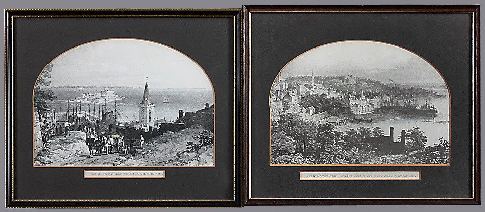 Englische Ortsansichten von Clifton, Guernsey und St. Pierre. Ca. 17 x 24,4 cm, 16,5 x 24,3 cm (Bildausschnitte). Dek. Passepartouts mit bogenförmigem Ausschnitt. Vergl. RR..