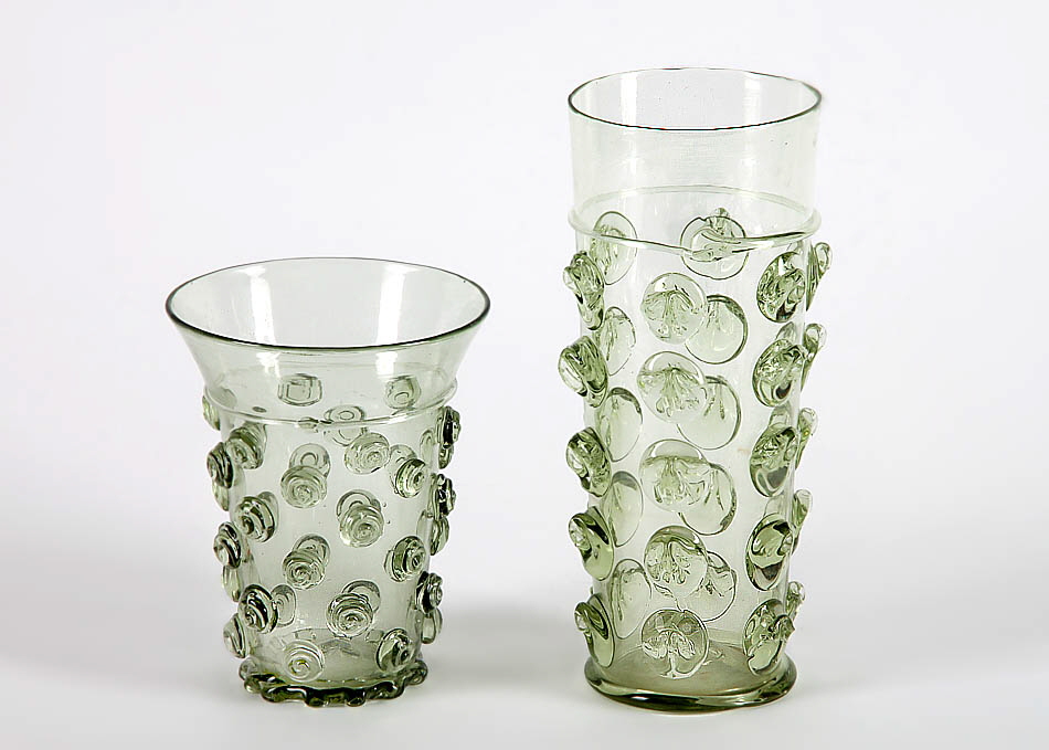 Olivgrünes Glas. Am Boden Abriss. Aufgeschmolzene Nuppen, oben und unten aufgelegter Glasfaden. H 11,8 cm, 17,8 cm.