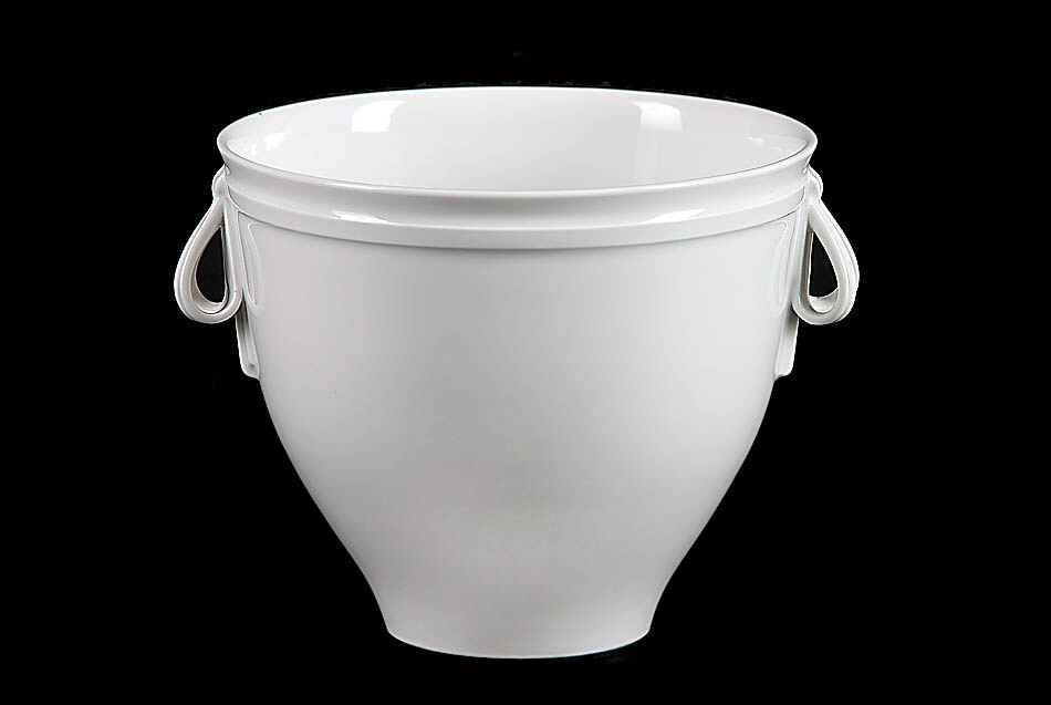 KPM Berlin, blaue Zeptermarke, 1960er/70er Jahre. Konischer, bauchiger Gefäßkörper, zwei kleine, offene Bandhenkel. Weißporzellan. H 11,3 cm, D oben 13,4 cm.
